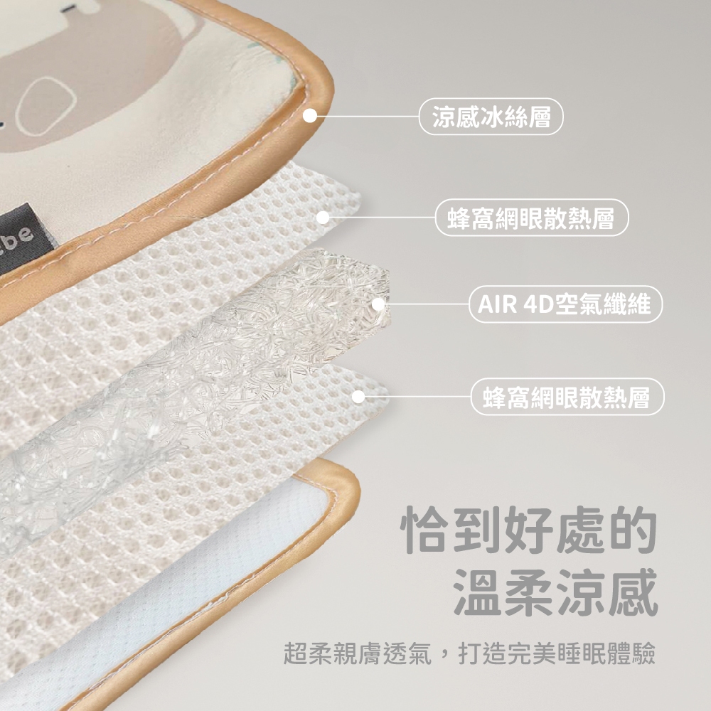 【表布材質】 : 冰絲柔面料(正面)、3D蜂窩型透氣網(背面/四層結構)